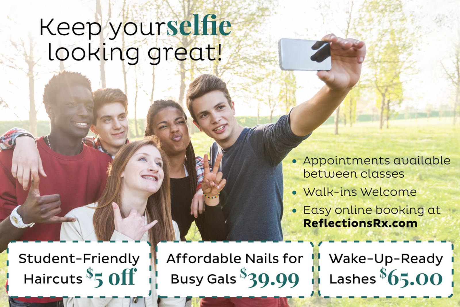 Reflections Salon is Rexburg's go-to spot for students who want to look sharp and feel confident. We offer men's & women's haircuts, fades, tapers, perms, beard clean-ups, plus color, highlighting, Brazilian blowouts, and hair extensions. We also specialize in nails, lashes, waxing, permanent jewelry, and more—all in one convenient location minutes from campus.